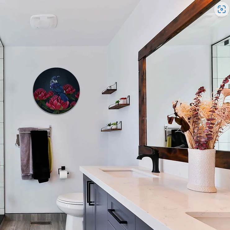 Our Tui bird Highness resting on a bed of rich magenta pink waratah flowers while she gazes at her majestic King.