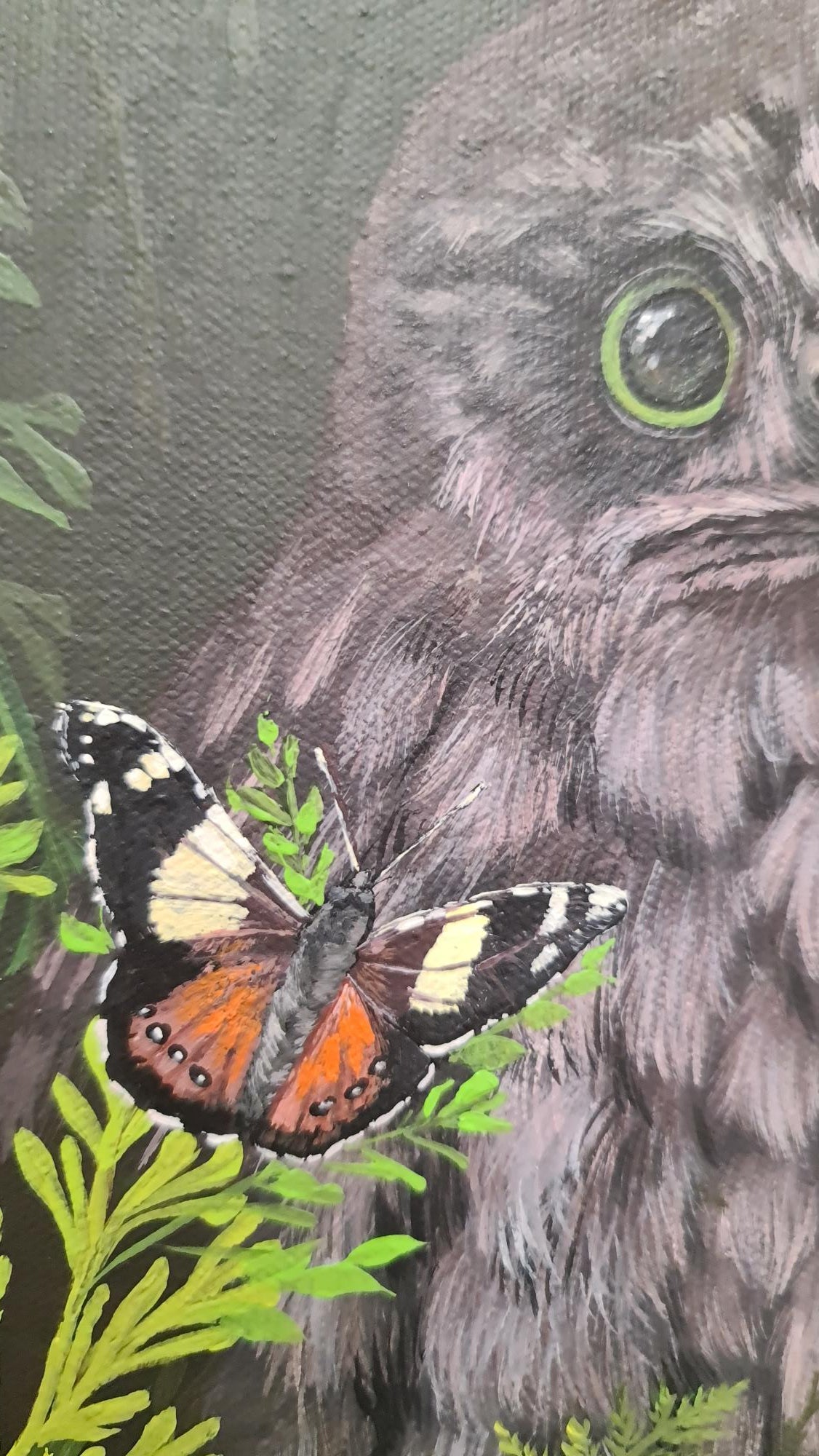 In the quiet of the night, a young NZ morepork owl is visited by two surprise guests (NZ Admiral Moth), their presence warming the forest foliage around him.