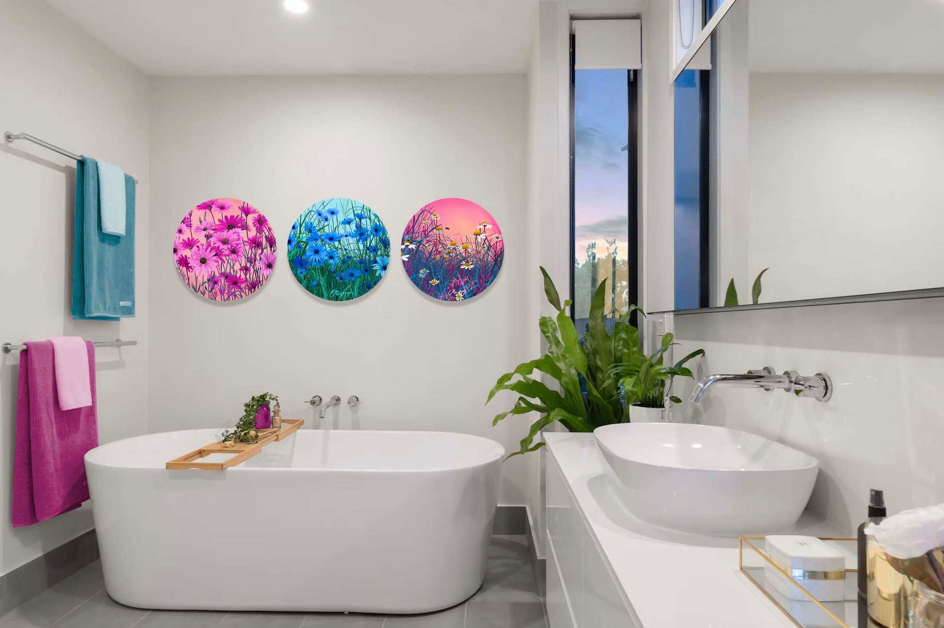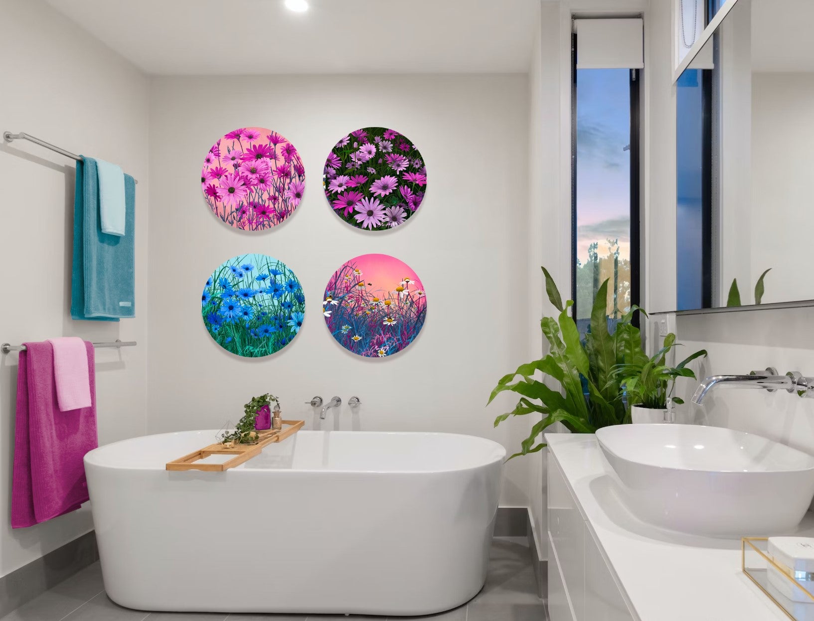 This daisy artwork is part of a series of four and can be paired up with the examples in the photo.
