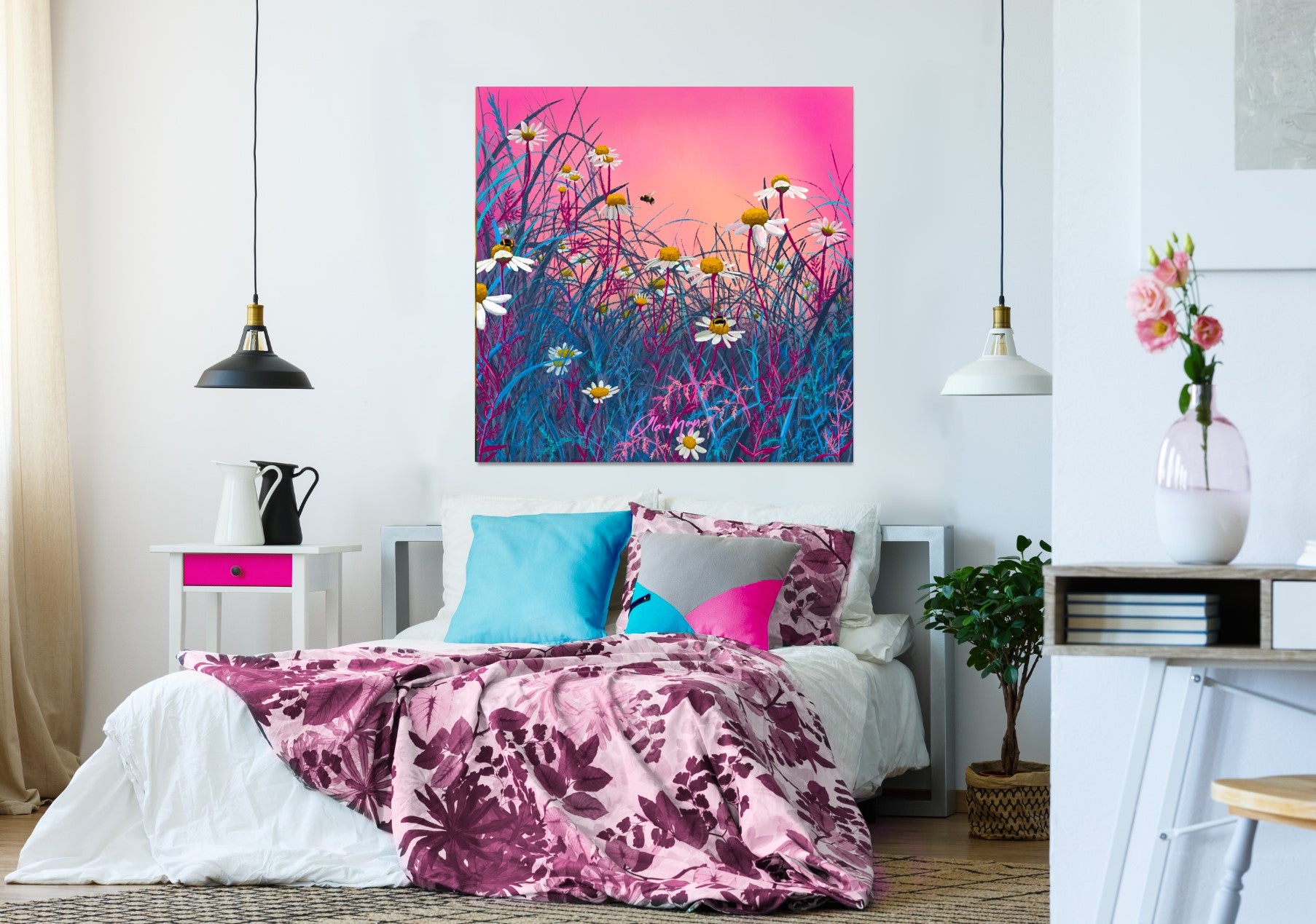 This daisy artwork is part of a series of four and can be paired with the examples in the photo.