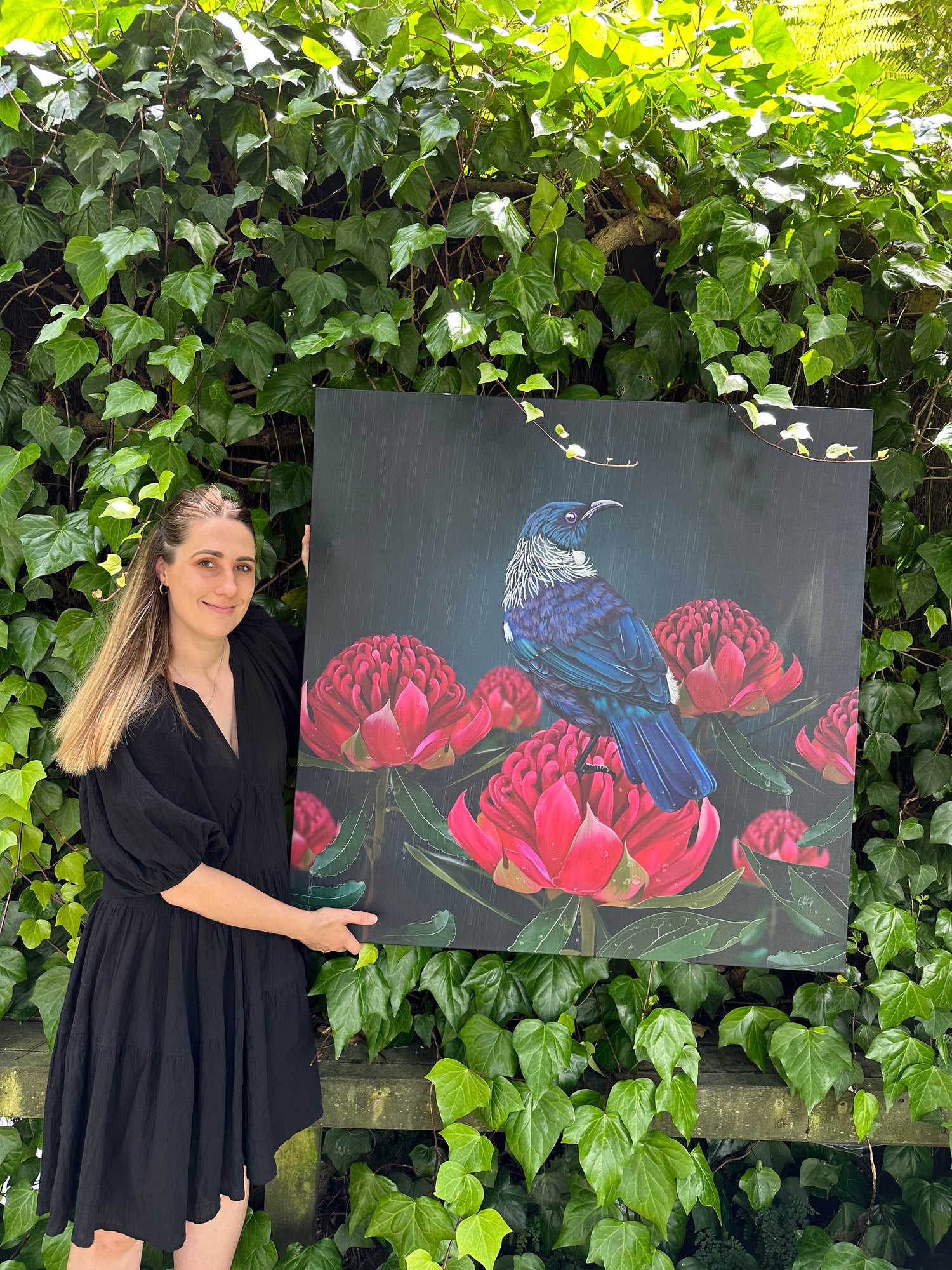 Textured acrylic paint is layered over the canvas to create the appearance and feel of an original piece.